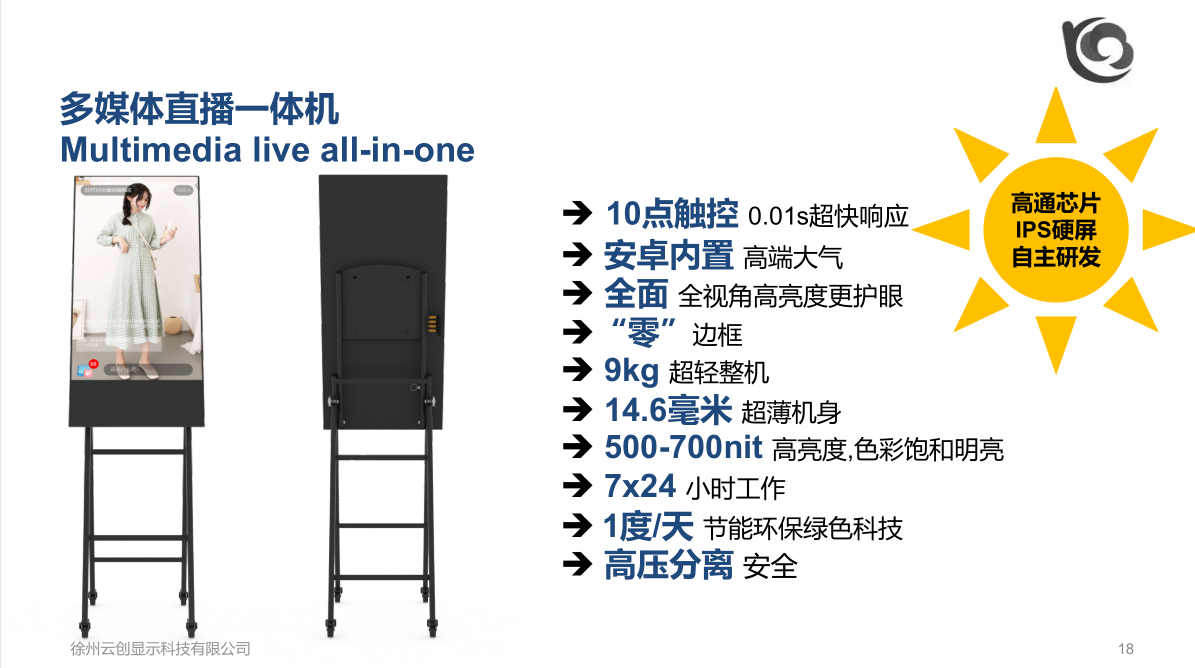 10点触控 0.01s超快响应 安卓内置 高端大气 全面 全视角高亮度更护眼“零” 边框 9kg 超轻整机 14.6毫米 超薄机身 500-700nit 高亮度,色彩饱和明亮 7x24 小时工作 1度/天 节能环保绿色科技 高压分离 安全