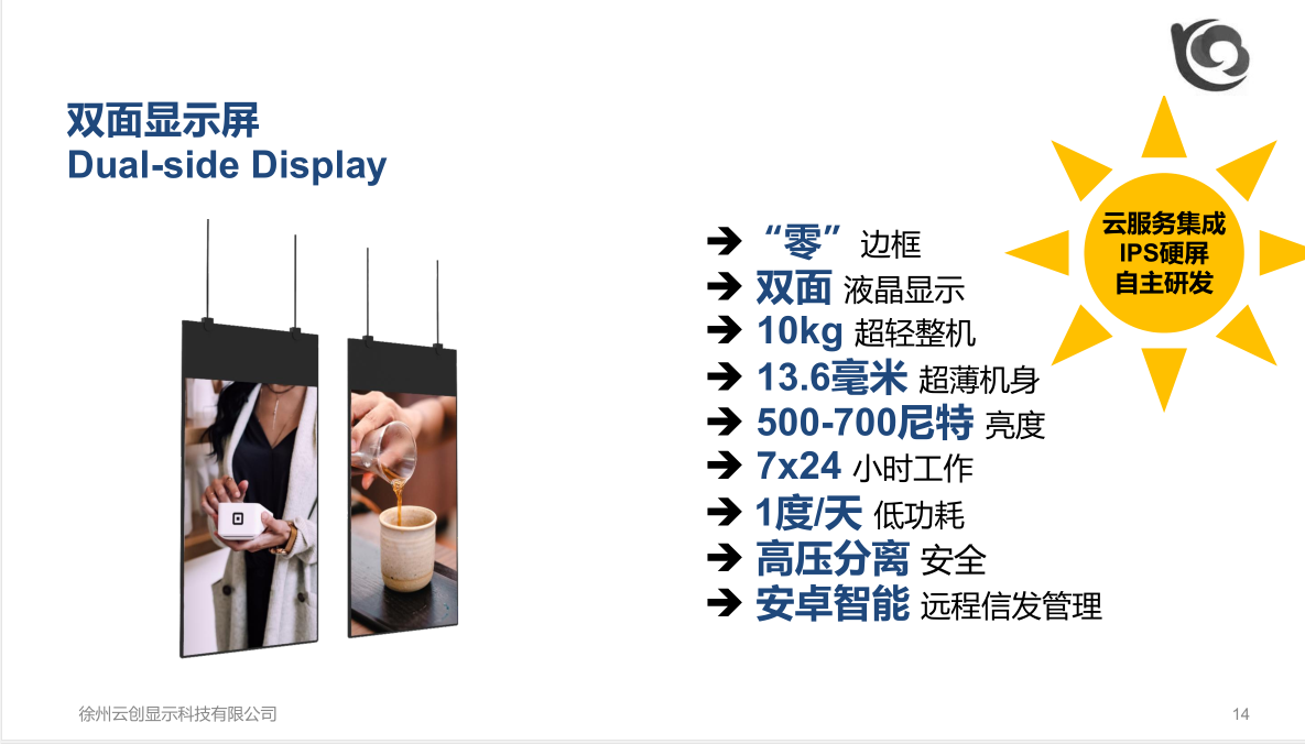 “零” 边框 双面 液晶显示 10kg 超轻整机 13.6毫米 超薄机身 500-700尼特 亮度 7x24 小时工作 1度/天 低功耗 高压分离 安全 安卓智能 远程信发管理