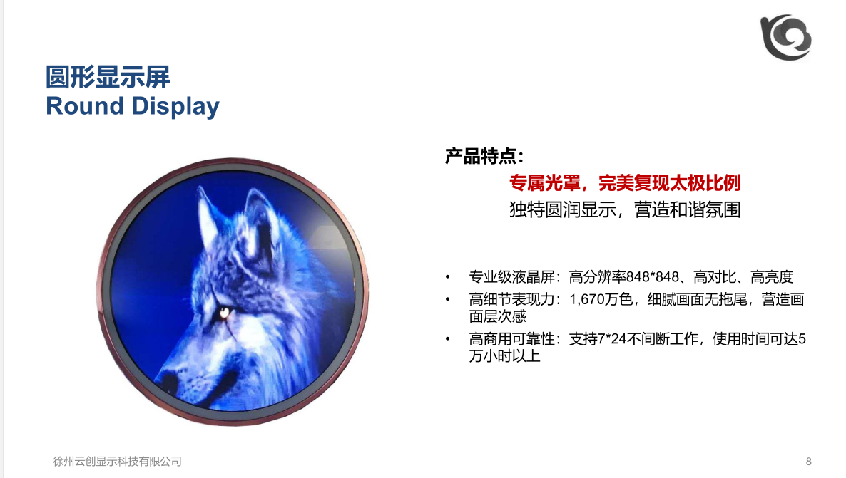 产品特点:专属光罩,完美复现太极比例独特圆润显示,营造和谐氛围• 专业级液晶屏:高分辨率848*848、高对比、高亮度• 高细节表现力:1,670万色,细腻画面无拖尾,营造画面层次感• 高商用可靠性:支持7*24不间断工作,使用时间可达5万小时以上